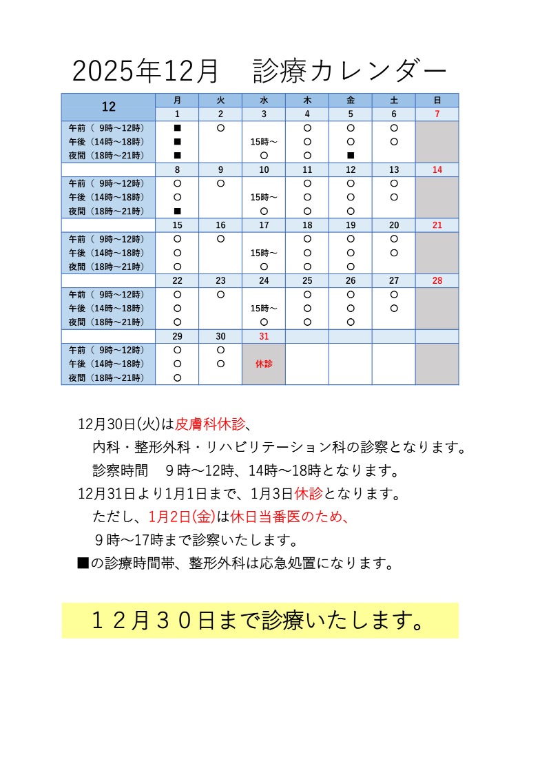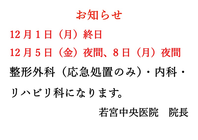 12月1日(月)終日 12月5日(金)夜間、8日(月)夜間 診療内容変更のお知らせ
